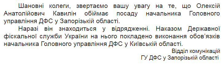 – Шановні колеги, звертаємо вашу увагу на те, що Олексій Анатолійович Кавилін обіймає посаду начальника Головного управління ДФС у Запорізькій області. Наразі він знаходиться у відрядженні. Наказом Державної фіскальної служби України на нього покладено виконання обов’язків начальника Головного управління ДФС у Київській області, – говориться в повідомленні.
