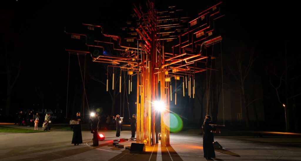 На металевих «гілках» розміщуватимуть трубки замість листя, на кожній викарбувано ім’я полеглого захисника чи захисниці із Запорізької області. Вони створюють передзвін, як символ відлуння голосів полеглих воїнів.