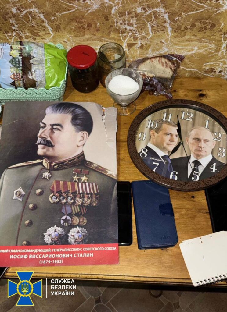 Під час обшуків у нього вилучили комп’ютерну техніку та мобільний телефон із доказами злочинної діяльності. Також у нього знайшли предмети із зображенням керівництва РФ.