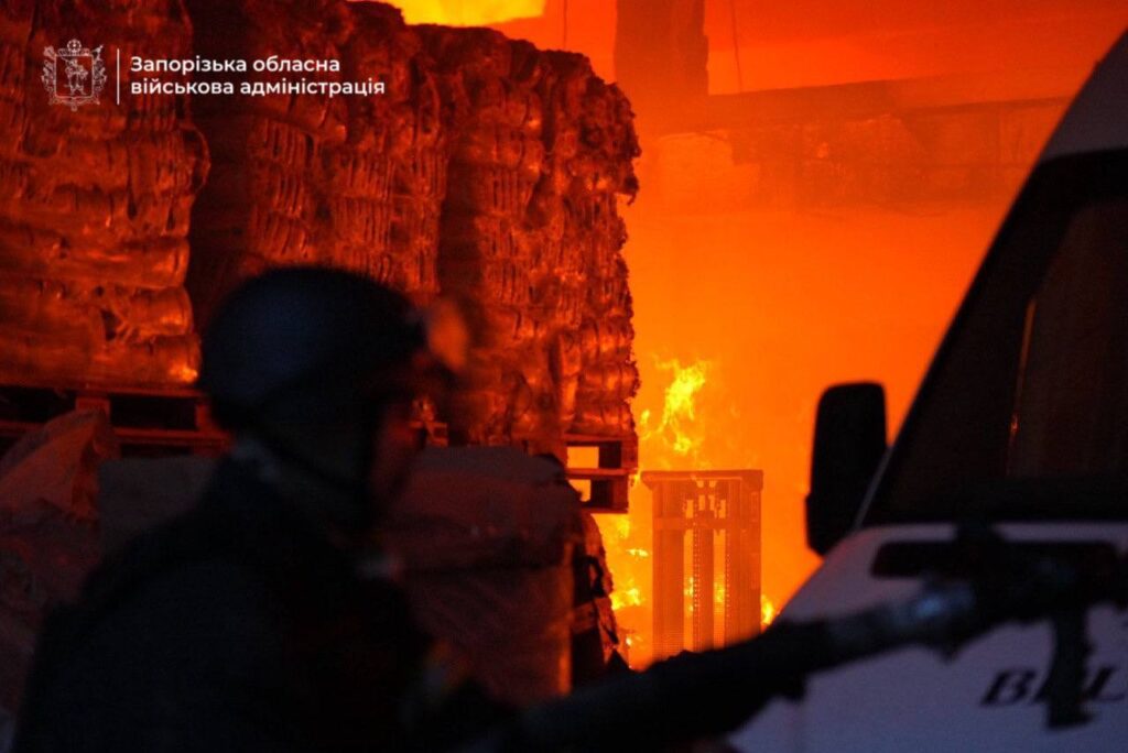 Через удари ворожих «шахедів» у місті загорілось гуманітарне підприємство. Пошкоджено машини, магазин та зупинка громадського транспорту.