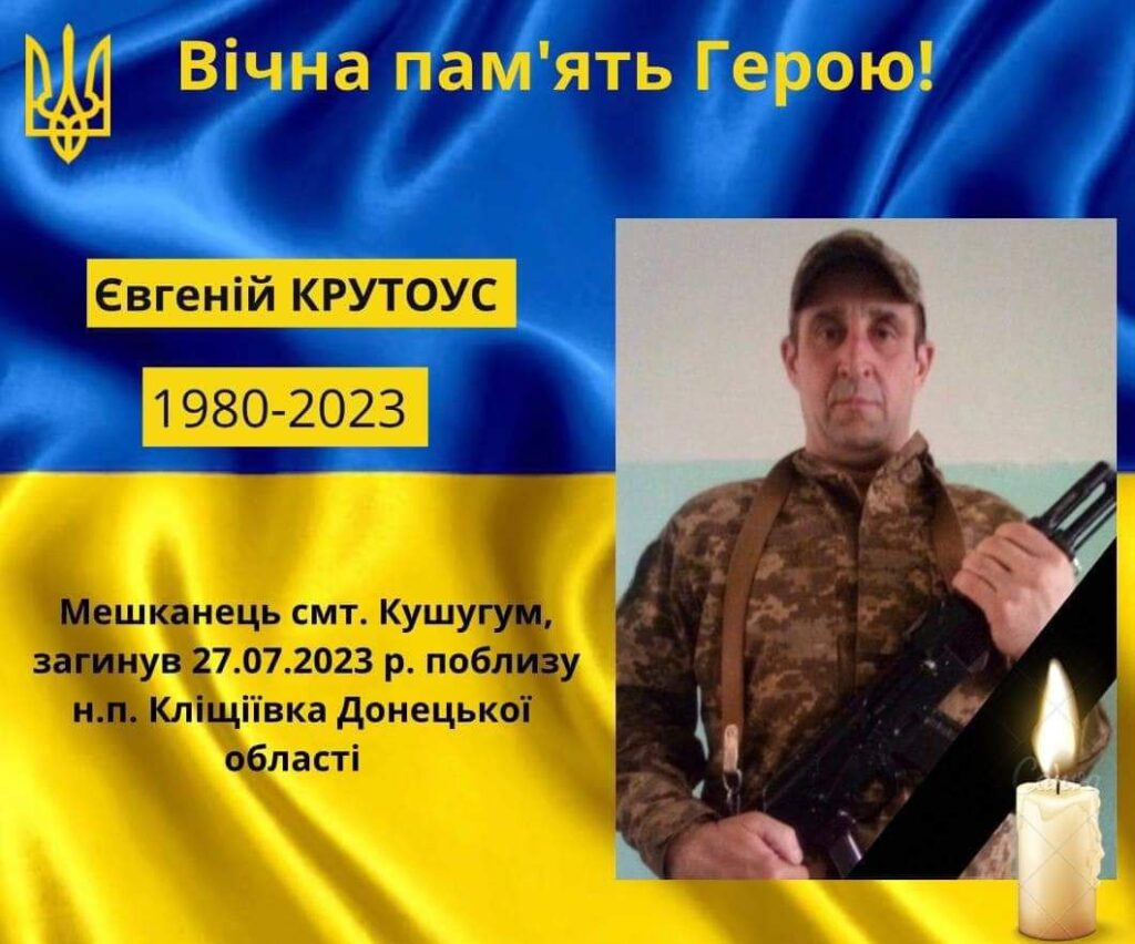 15 лютого Євген Крутоус добровільно став на захист рідної землі. Житель Кушугума захищав Україну від російських загарбників у Донецькій області. Але 27 липня, поблизу села Кліщеївка Бахмутського району, він загинув. Захиснику було 43 роки.