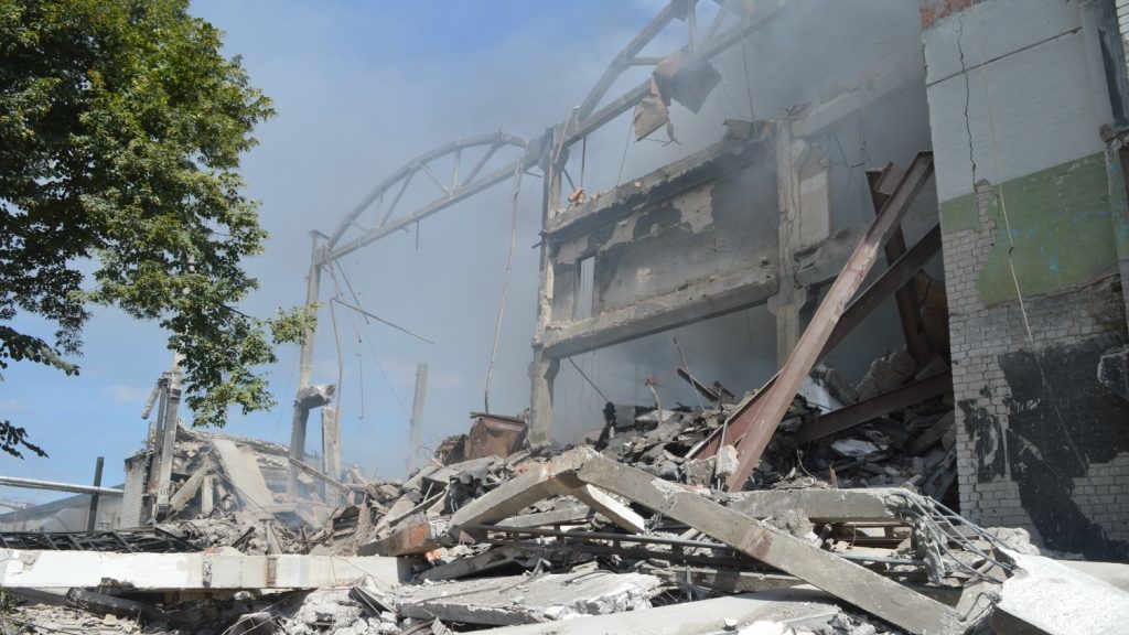 Про 11:51 На місці пожежі в районі третього поверху стався вибух, в результаті чого сталося часткове руйнування міжповерхових перекриттів і покрівлі, а площа пожежі збільшилась до 1000 кв.м.