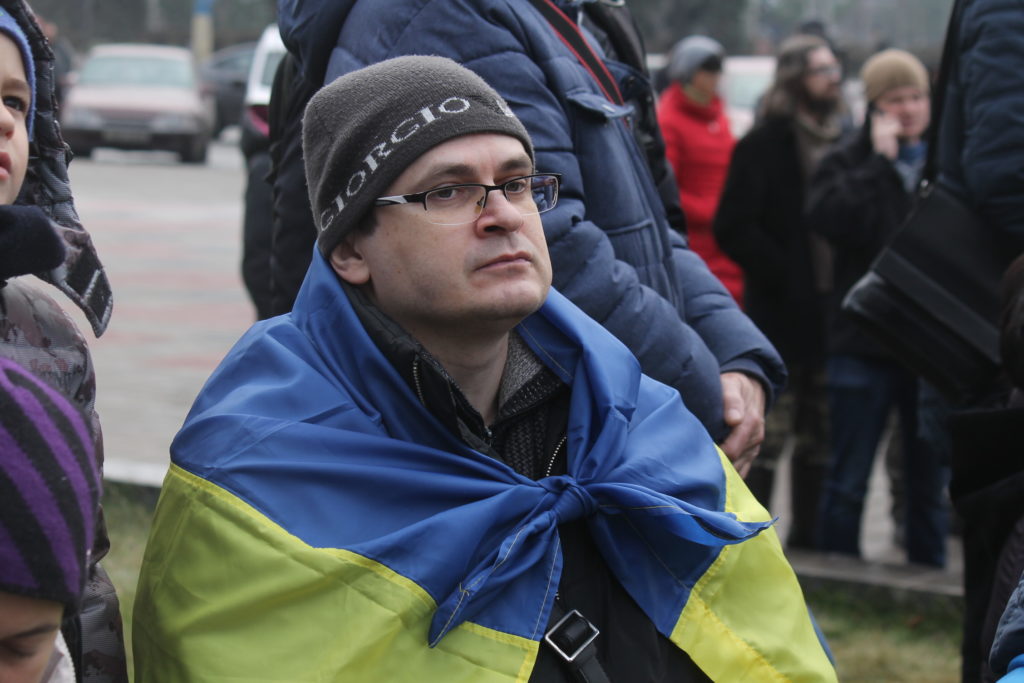 «Всі, хто сьогодні зібрався тут, проти війни і, звичайно, хочемо миру. Але є маленьке «але». Ми – проти миру на умовах ворога. Досить нам оглядатися на сусідню країну, яка має імперські амбіції», – сказал ветеран АТО, общественный активист Михаил Пирог.