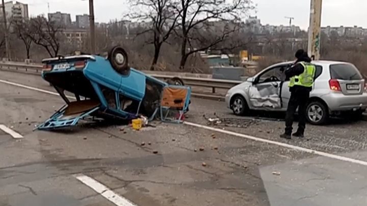 Сьогодні, 20 грудня, в центрі Запоріжжя на дамбі у Вознесенівському районі на проспекті Соборному відбулося серйозне ДТП – один з автомобілів, «Москвич», перекинувся.