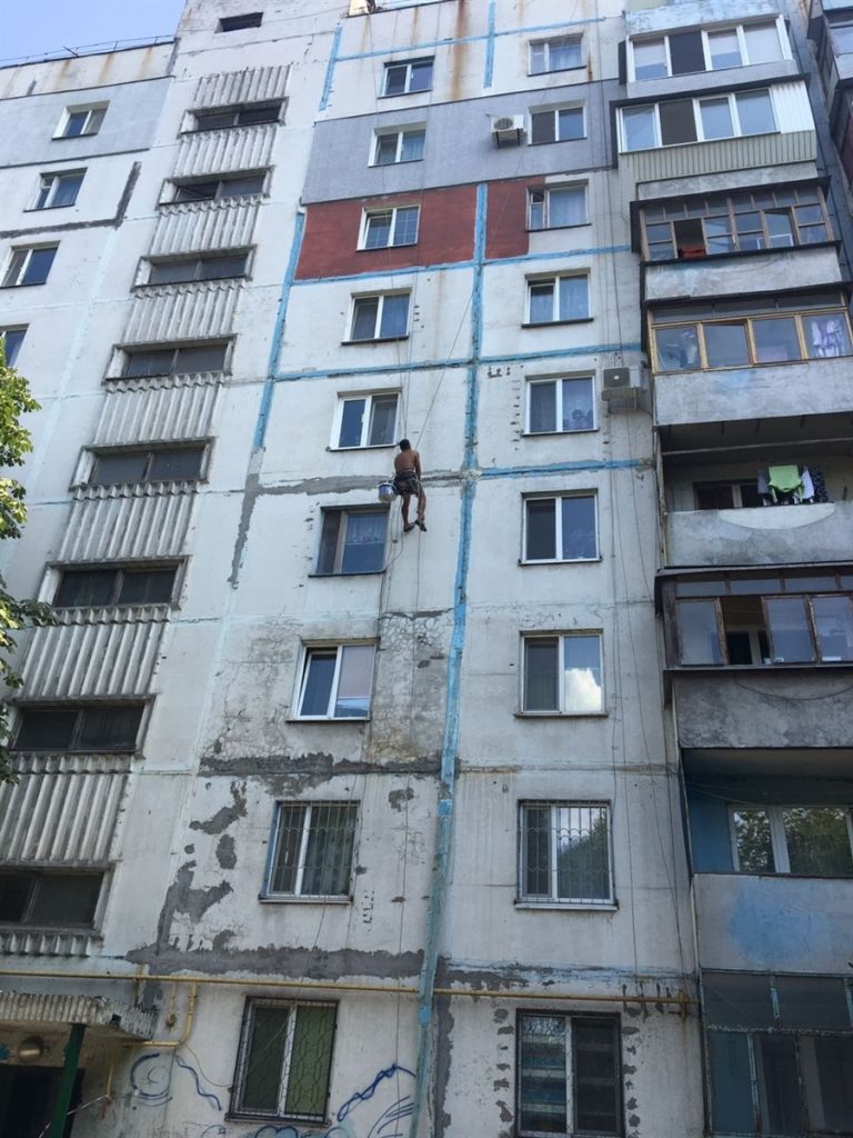 Днями верхолази розгорнули роботи за адресою вул. Трегубенко, 24, що в Дніпровському районі. Виконують герметизацію міжпанельних швів – закладають тріщини на фасаді будівлі.