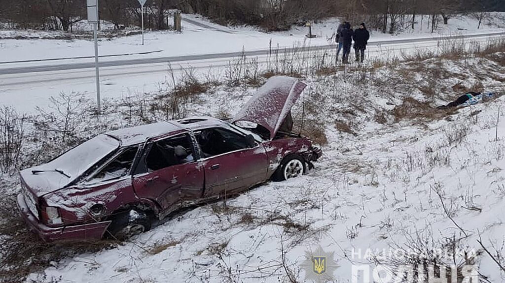 Під час спуску з дороги через ожеледицю водій не впорався з керуванням, машину занесло, і вона злетіла у кювет, де перекинулася.