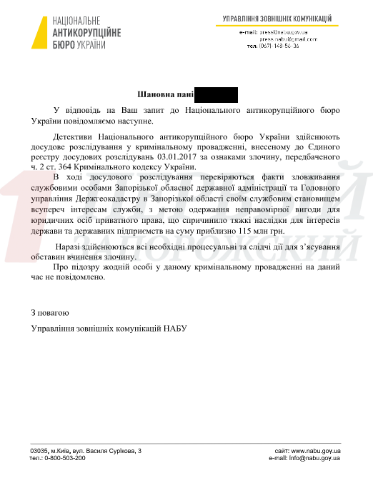 Как нам сообщили, в ответе на информационный запрос к Национальному антикоррупционному бюро Украины в настоящий момент детективы НАБУ все еще осуществляют досудебное расследование в уголовном производстве по части 2 ст. 364 Уголовного кодекса Украины (злоупотребление властью или служебным положением).