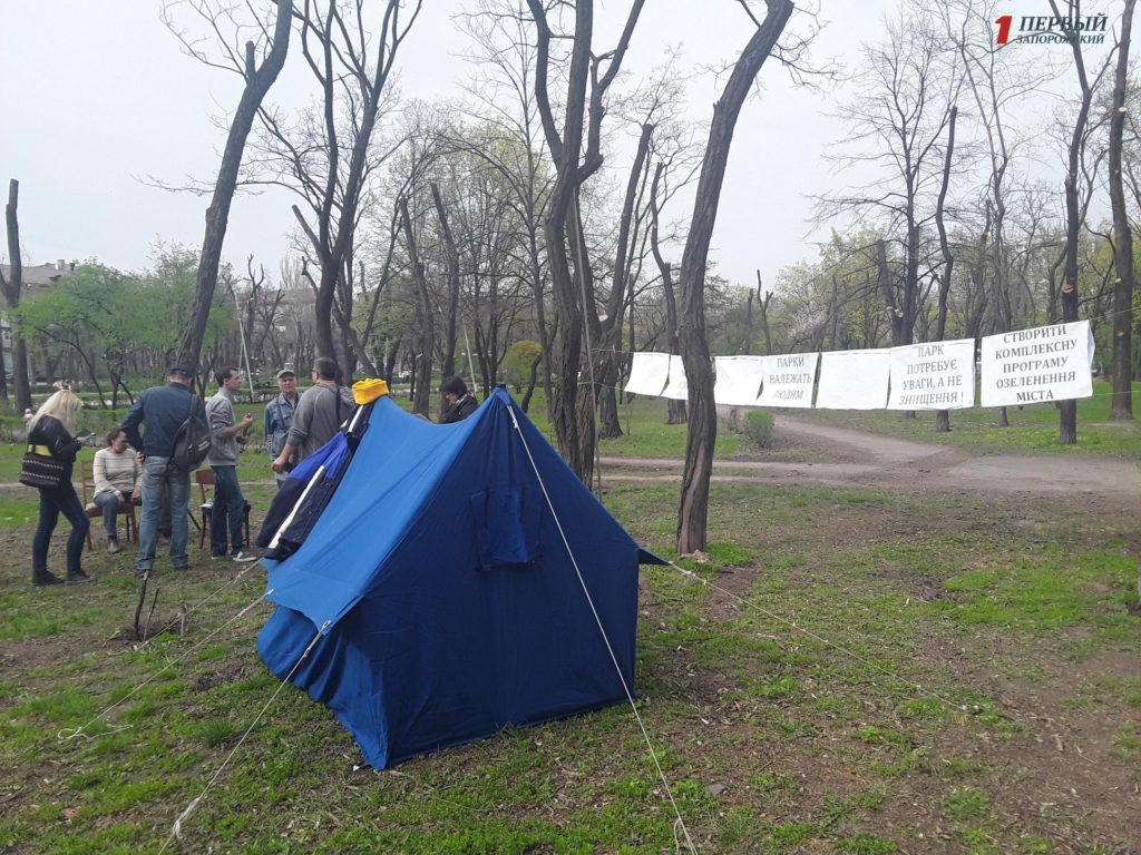 В парке находятся палатки бессрочной акции за его сохранение. Противников его уничтожения на месте сейчас около 20 человек.