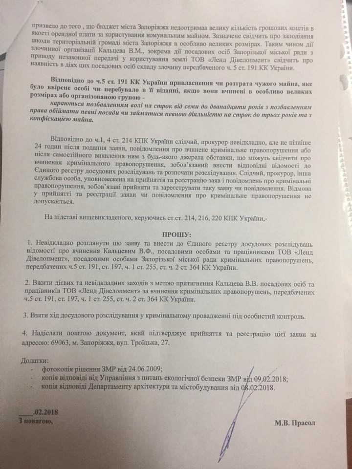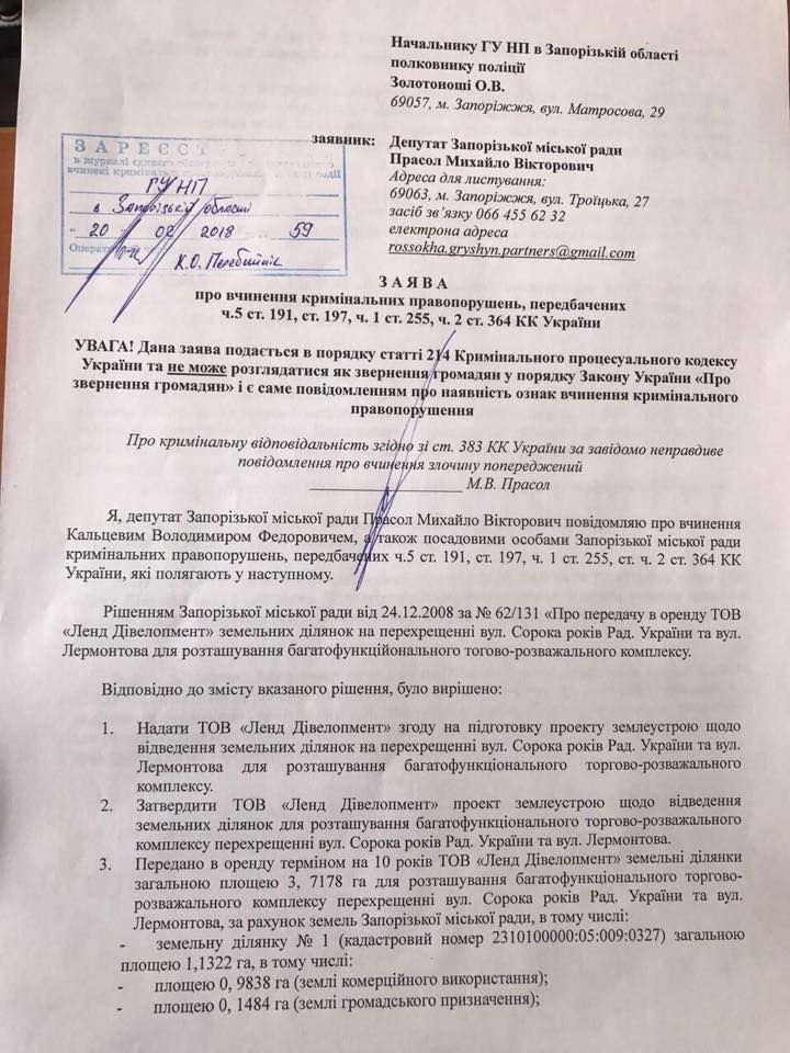 Депутат Запорожского городского совета Михаил Прасол написал заявление в полицию, где просит правоохранителей проверить законность передачи земельного участка в центре города напротив Универмага «Украина» в долгосрочную аренду фирме, которую связывают с братьями Кальцевыми.