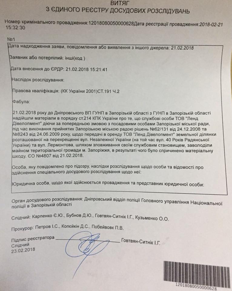 В полиции Запорожья проверят законность передачи земельного участка в аренду фирме из орбиты Кальцевых