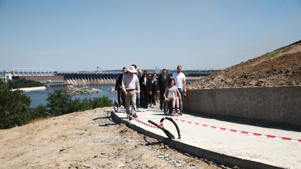 Перша леді Олена Зеленська та заступник голови Офісу Президента Кирило Тимошенко відвідали Хортицю. Вони разом з представниками маломобільних груп населення – людьми з інвалідністю, людьми літнього віку, батьками з маленькими дітьми – ознайомилися з ходом перетворень на острові. Наразі тут триває оновлення знакових об’єктів: пагорба з флагштоком, Музею та громадського простору «Козацьке коло».