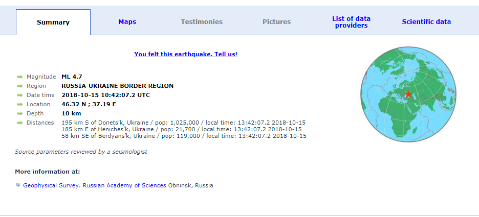 Землетрясение магнитудой 4,7 произошло 15 октября на границе между Украиной и Россией в Азовском море, сообщает Европейско-Средиземноморский сейсмологический центр.