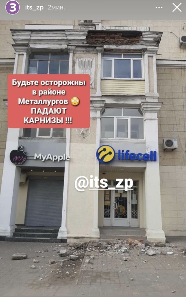 Як видно на фотографіях, почав руйнуватися карниз будинку на проспекті Металургів (з боку Соборного проспекту), внаслідок чого цегли падали прямо біля входу в один з магазинів. На щастя, ніхто не постраждав.