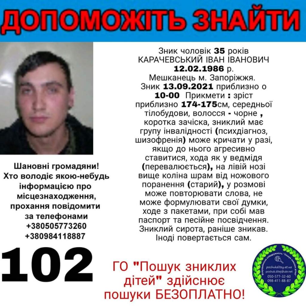 13 вересня близько 10 ранку зник 35-річний Карачевський Іван Іванович. Чоловік має групу інвалідності — шизофренію. Може бути агресивним, якщо на нього починають кричати, має «ведмежу» ходу, має шрам від ножового поранення на лівій нозі, у розмові може повторювати слова, не може формулювати думки.