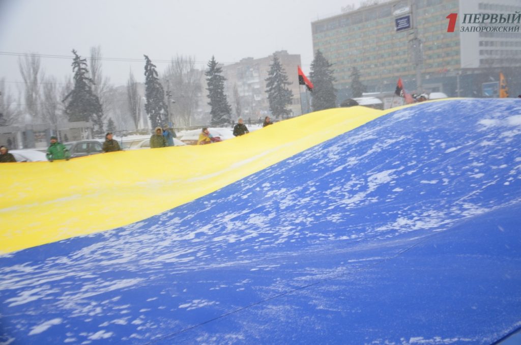 Организаторами акции выступили представители запорожской ячейки Всеукраинского объединения «Свобода», «Национальный Корпус» и «Правый сектор». Активисты развернули перед Запорожской облгосадминистрацией 25-метровый флаг Украины.