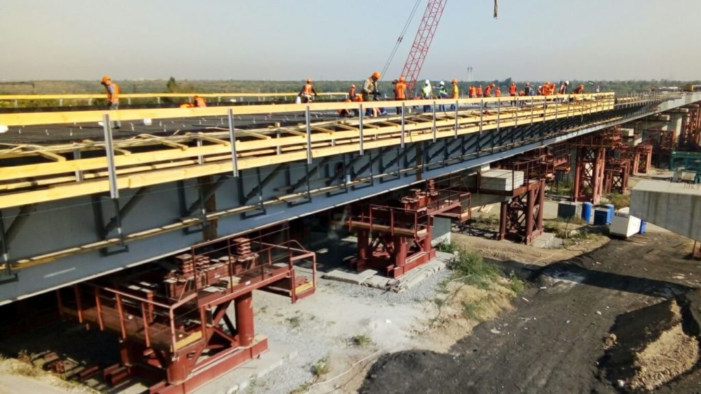 На данный момент на этом этапе работ уже завершено работы по устройству вспомогательных конструкций для устройства пролетного строения,  завершен монтаж балок металлической пролетного строения – смонтировано 30 блоков весом 1394 тонн, пролетное сооружение опущено на проектные отметки, завершаются работы по подливке опорных частей, завершено работы по армированию первой захватки плиты проезда длиной 26 метров, завершено работы по сварке металлических блоков пролетного строения и т.д.