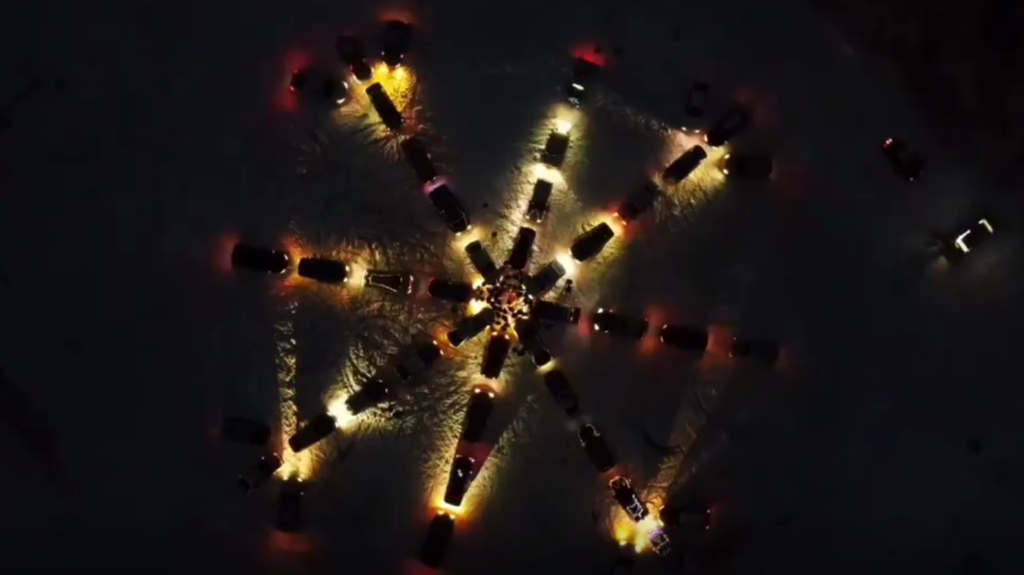 На вкритому снігом майданчику автомобілісти збудували свої машини у вигляді сніжинки. Щоб створити святкову атмосферу, автомобілі прикрасили гірляндами та мішурою, а після настання темряви – увімкнули ілюмінацію та фари.