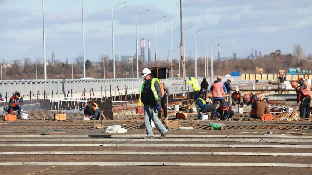 Роботи на флагманському об’єкті президентської програми «Велике будівництво» тривають згідно графіка – зараз на 3-й споруді балкового мосту продовжуються роботи з армування 4-ї захватки плити проїзду. Загалом таких захваток потрібно зробити вісім. Одночасно підрядник виконує роботи з монтажу опалубки 5-ї захватки та готується до бетонування. Вже укладено 600 кубометрів бетону, на черзі ще 1000. Паралельно ведуться роботи з облаштування тротуару та встановлення бар’єрної огорожі.