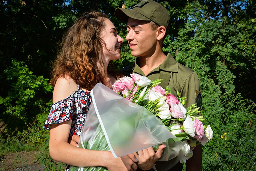 Гвардієць Олександр, який щодня відважно захищає нашу країну, із квітами в руках дуже зворушливо освідчився коханій під оплески своїх побратимів. Із неприхованим хвилюванням і тремтінням в руках, він обережно одягнув каблучку на руку майбутньої дружини після такого довгоочікуваного «Так!».