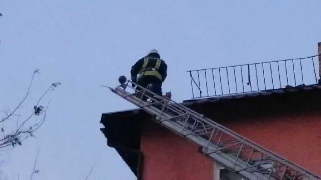 Прибувши на місце події, співробітники ДСНС встановили, що на даху триповерхового житлового будинку перебуває кіт.