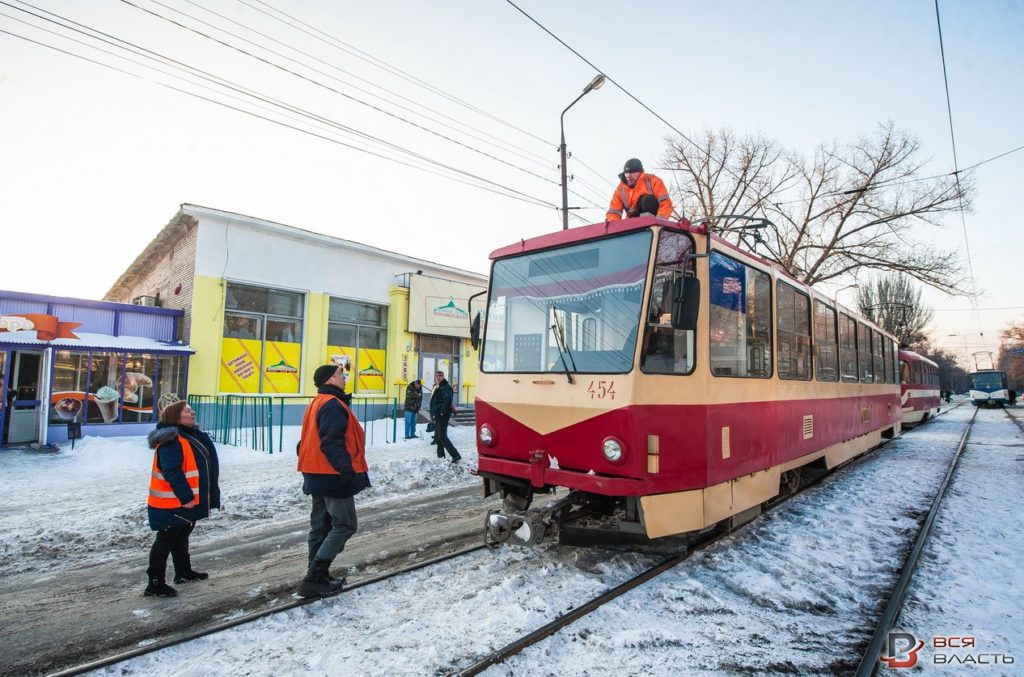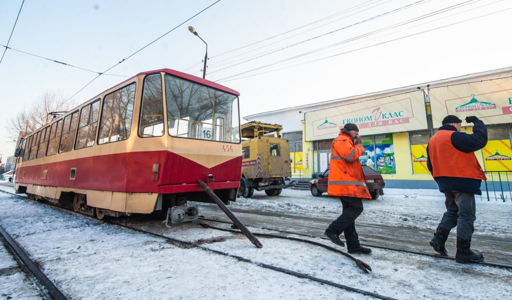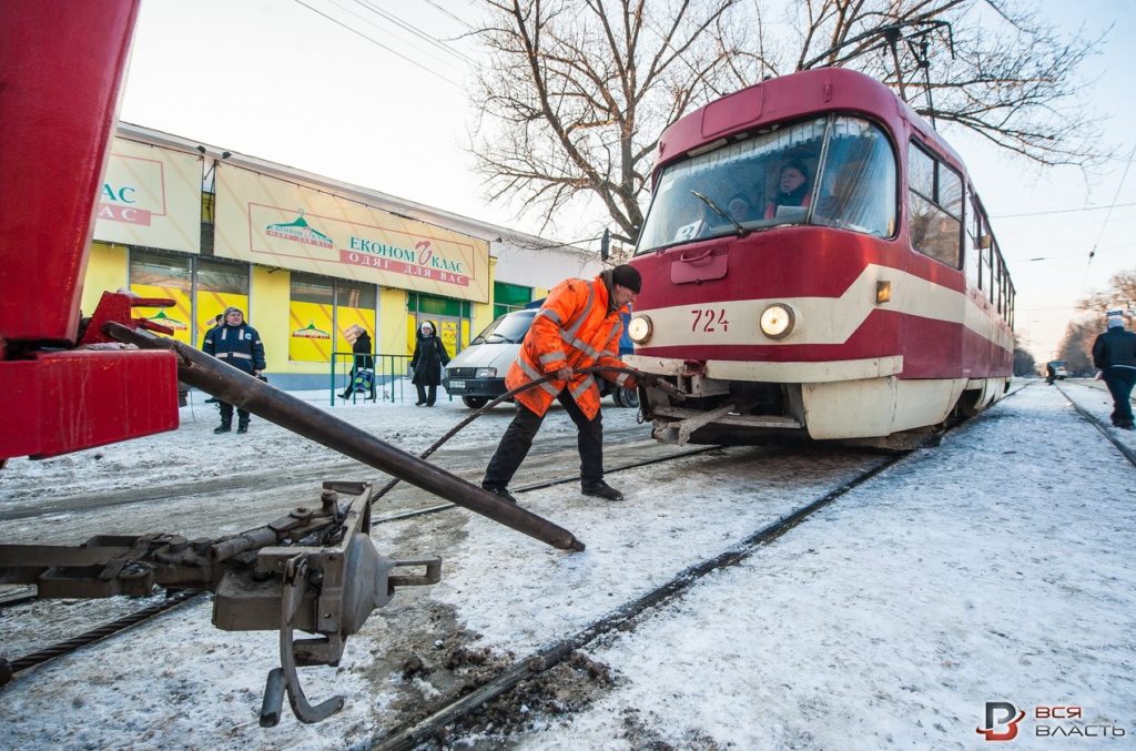 Вышедший из строя трамвай с помощью другой электромашины отбуксировали в депо.