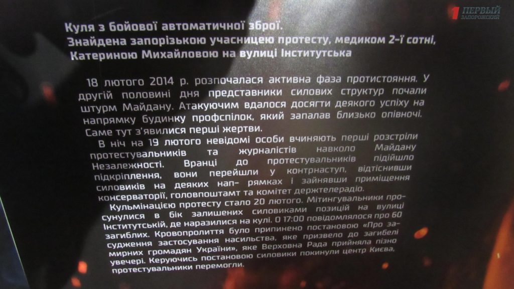 – Новая выставка более качественно и эмоционально представляет события Майдана. Около 80% экспонатов уже были представлены в предыдущей выставке. Новые предметы запорожцы увидят только сейчас, поскольку не было возможности показать их раньше. Так, среди экспонатов, на стенде Небесной сотни, выставлена пуля, которую выпустили из автомата Калашникова на площади в Киеве. К счастью, пуля не попала в людей, но она является символом ненависти к украинцам, которые отстаивали свои законные права, – считает Михаил Мордовской.