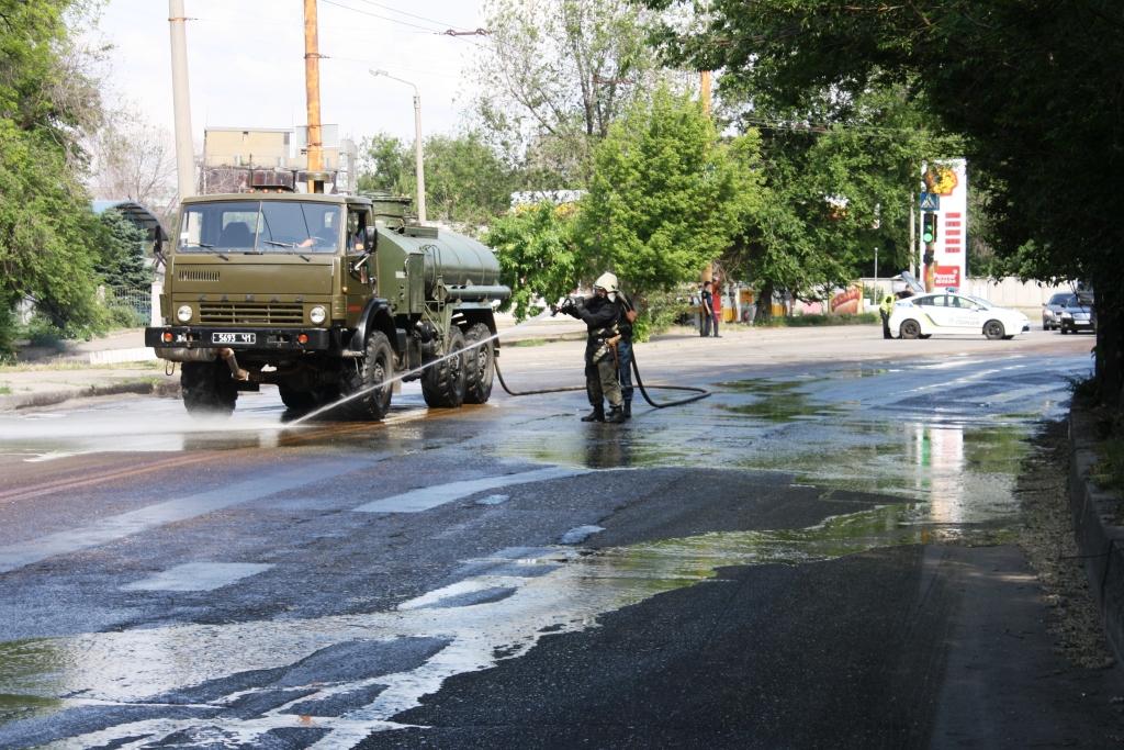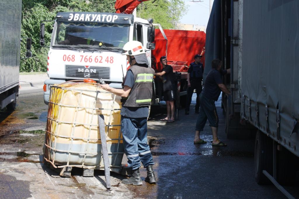 В Запорожье из грузовика выпали емкости с коагулянтом: вещество разлилось по дороге - ФОТО