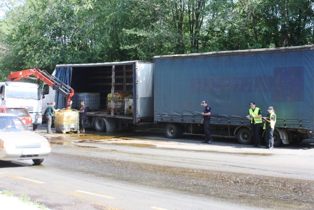 Сотрудники патрульной полиции перекрыли проезжую часть. Спасатели с помощью автоподъемника подняли емкости и поставили их на платформу, после чего смыли остатки коагулянта с проезжей части.