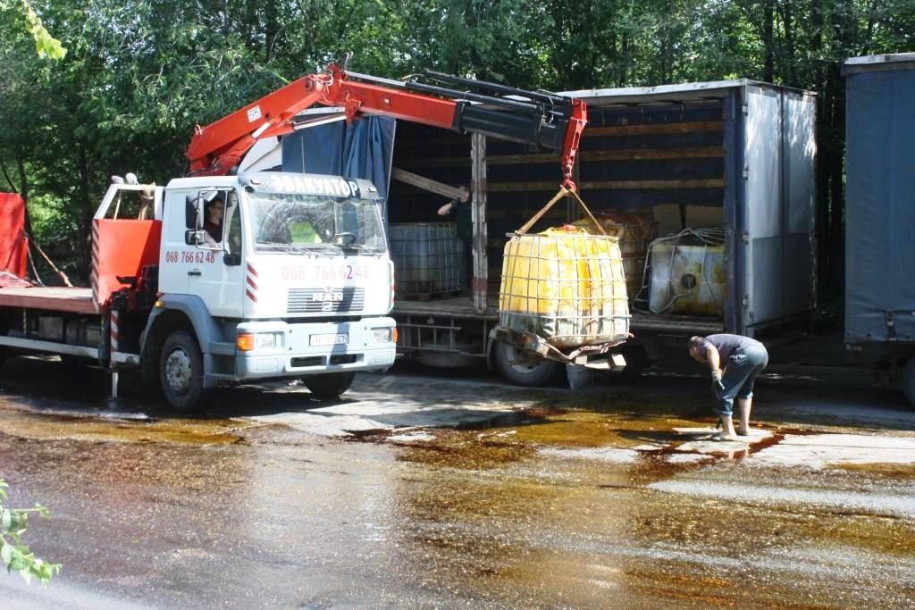 Сотрудники патрульной полиции перекрыли проезжую часть. Спасатели с помощью автоподъемника подняли емкости и поставили их на платформу, после чего смыли остатки коагулянта с проезжей части.