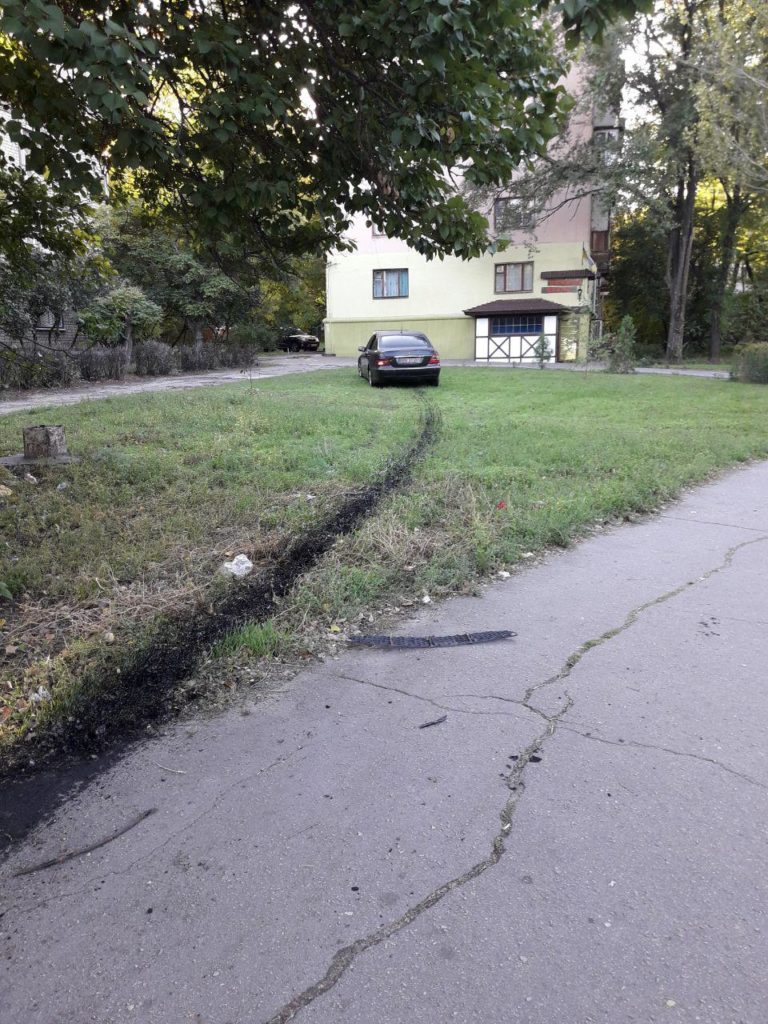 Инцидент произошел в пятницу на улице Леонида Жаботинского. Свидетели позвонили в полицию и сообщили, что Mercedes на литовских номерах с выбитым стеклом заехал на тротуар и оставил на газоне около дома черный тормозной след.