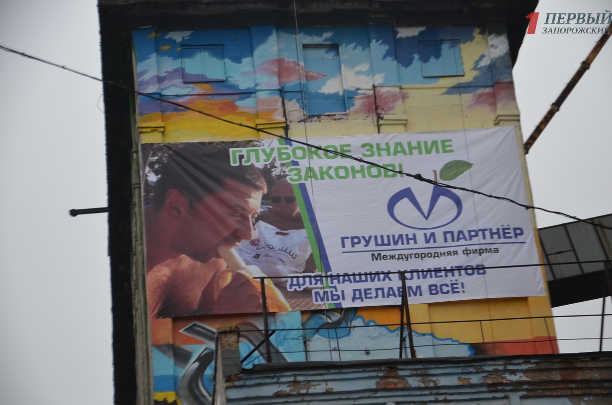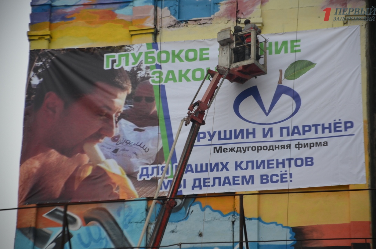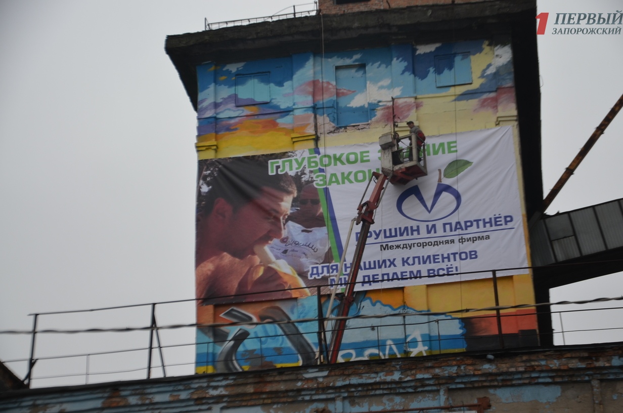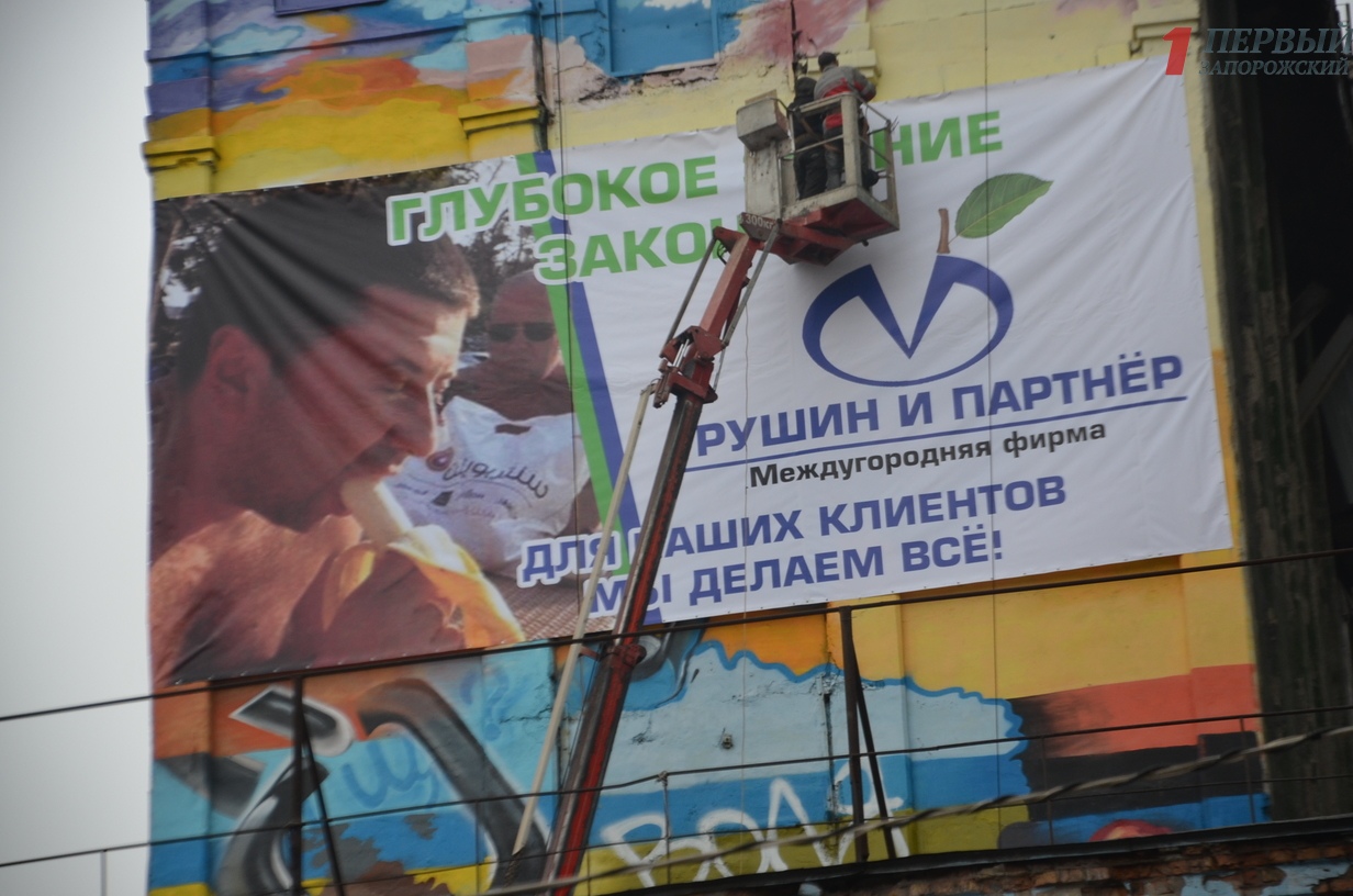 Сегодня, 27 марта, с помощью автовышки по заказу собственника этого помещения Максима Дрозденка рабочие повесили плакат с троллингом его давнего оппонента депутата Запорожского облсовета и главы областной ячейки фракции “Укроп” Ярослава Гришина.