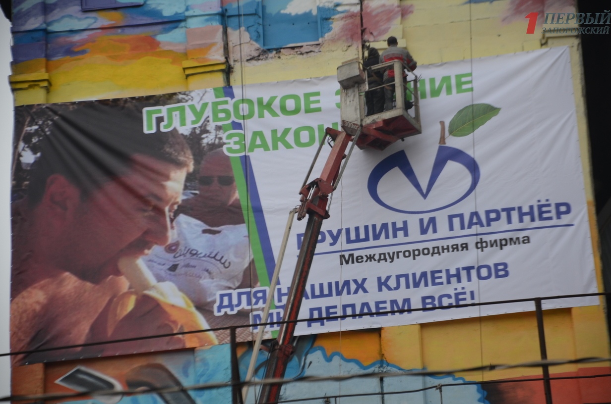 Теперь лицо Савченко перекрыл плакат с профилем Ярослава Гришина, который ест банан. На плакате написано большими буквами “Глубокое знание законов”. С правой стороны переделанное название “Гришин и партнер. Междугородняя фирма”, а ниже еще одна надпись: “Для наших клиентов мы делаем все”.