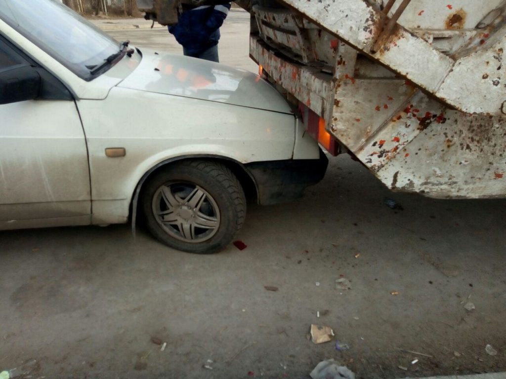Столкновение произошло по вине водителя мусоровоза, который, двигаясь задним ходом, не убедился в безопасности маневра и врезался в легковушку.