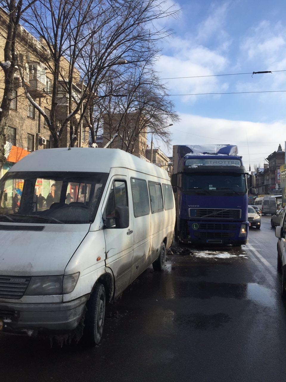 Как рассказали в пресс-службе патрульной полиции города, грузовик “Volvo” врезался в маршрутку “Mercedes-Benz”. К счастью, обошлось без пострадавших.