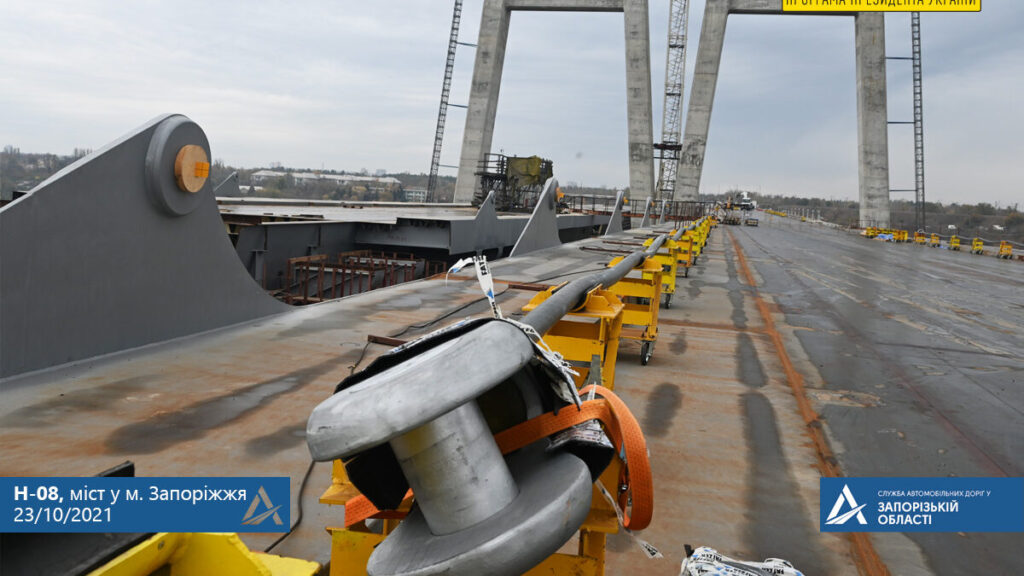На вантовому мосту з лівого берега Дніпра на Хортицю мостобудівники підійшли до чергового етапу будівництва. Наразі на верховій частині мосту біля пілону підрядники підготовлюють ванти до монтажу.