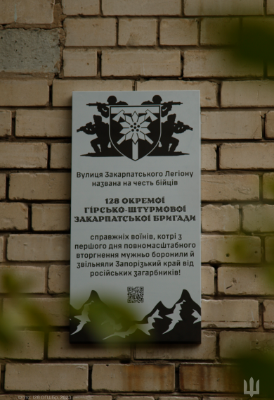 «Вулиця Закарпатського Легіону названа на честь бійців 128-ї окремої гірсько-штурмової Закарпатської бригади. Справжніх воїнів, котрі з першого дня повномасштабного вторгнення мужньо боронили й звільняли Запорізькій край від російських загарбників», — йдеться у тексті на дошці.
