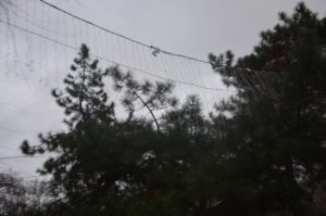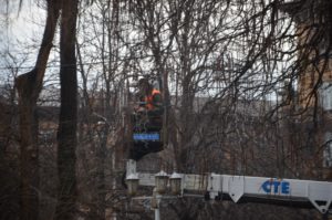 В центре города с помощью специального подъемника коммунальщики развешивают иллюминационные украшения в виде подвесок из гирлянд.