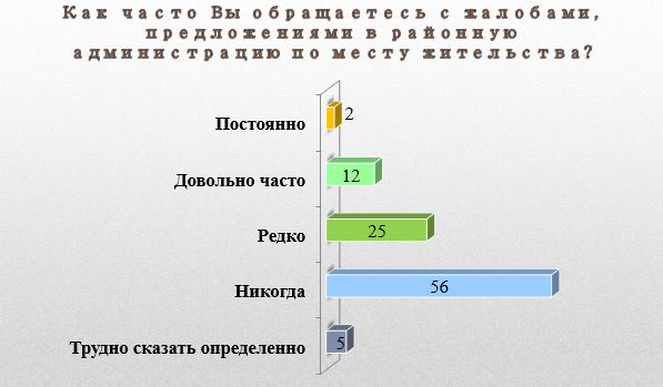 Социологи установили, что больше половины жителей (52 %) никогда не обращались с жалобами или предложениями в районные администрации. И только 2% делает это постоянно.