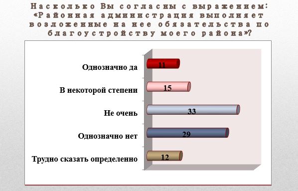 Что касается оценки выполняемых обязательств по благоустройству, то 62% горожан скептично относятся к работе райадминистраций. Тогда как 26% считают, что они справляются с поставленными задачами.