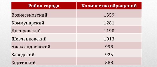 Если распределить конкретно по районам, то в Хортицком районе набралось больше всего озлобленных и не расположенных к сотрудничеству с райадминистрациями жителей. Больше всего горожане недовольны благоустройством районов.