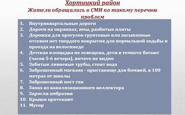 Два района Запорожья, а именно Хортицкий и Шевченковский, стали лидерами по количеству существующих проблем. Жители недовольны разбитыми дорогами, протеканием крыш, отсутствием фонарей и мусорных баков, мошенничеством, зарослями амброзии.