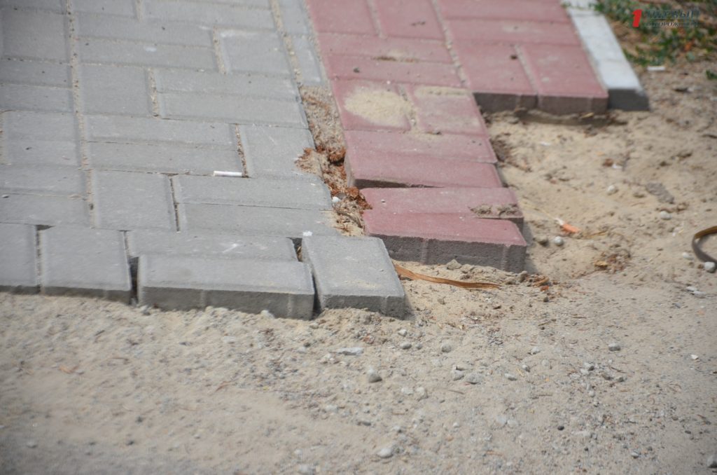 Аналогичную ситуацию мы заметили в трех местах сквера – на стыке с асфальтом из-за неоконченных работ, тротуарная плитка просто валяется на песке ничем не закрепленная. Строители должны были заняться установкой бордюров и выравниванием этих самых плит.