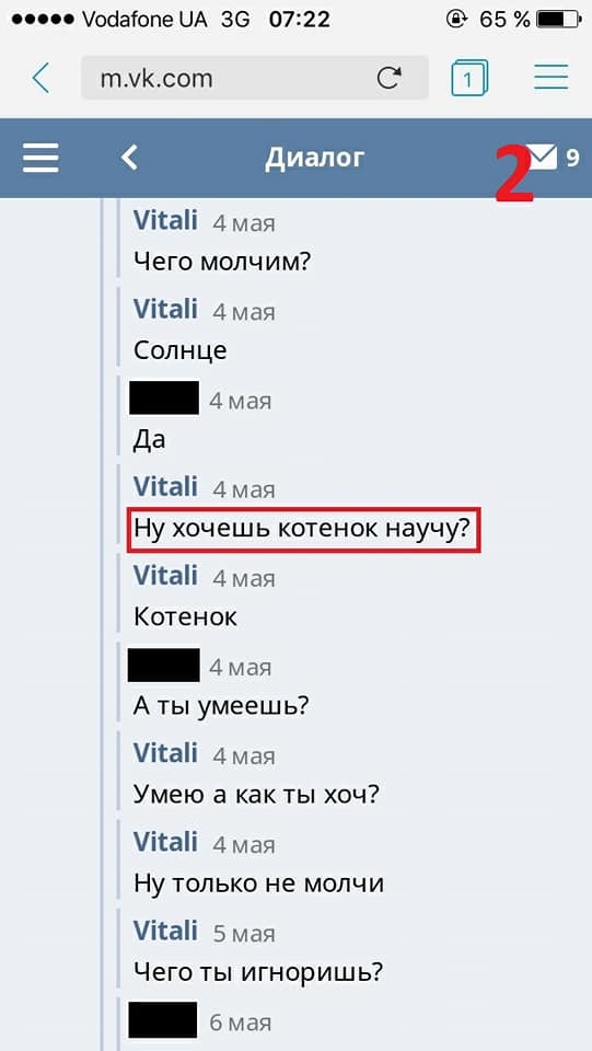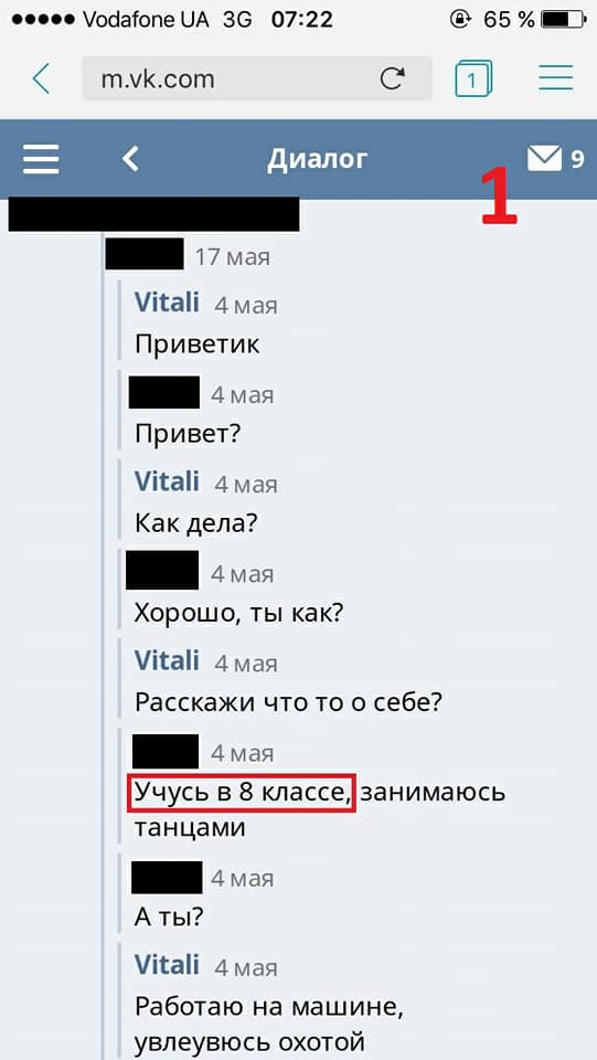 При этом во время одного из таких знакомств в соцсетях, Виталий «прокололся» и вышел на контакт с активистами, которые разыскивают предполагаемых педофилов. Во время очной встречи с активистами, Виталий признался, что не имел никаких недобрых намерений по отношению к 8-класснице, был нетрезв и не осознавал с кем ведет беседу. Впредь слезно пообещал никогда не заводить знакомств с несовершеннолетними девочками.