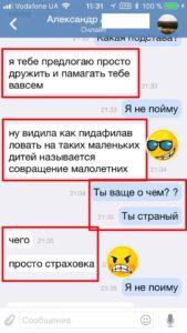 Тридцатидвухлетний  Александр самостоятельно завел знакомство с 13-летней девочкой в сети (фейковая страница активистов). Мужчина не стесняясь общался со школьницей на откровенные темы и даже настоял на том, чтобы остаться у девочки с ночевкой, когда родителей не будет дома. Мужчина несколько солгал про свой настоящий возраст:сначала приврав, что ему 15, позже добавил себе еще десяток лет и только на месте встречи выяснилось, что мужчине вовсе 32 года и у него есть девятилетний ребенок.