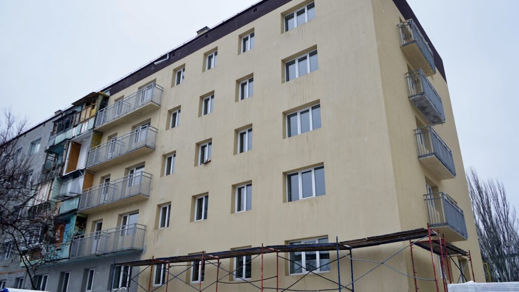У постраждалому під’їзді будинку на вулиці Зестафонська, 10, який у жовтні 2022 року постраждав внаслідок російського ракетного удару, роботи практично завершено.