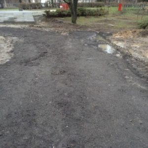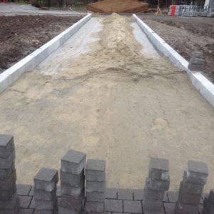 Сейчас на строительной площадке находятся груды песка, щебня и плитки для укладки дорожек.