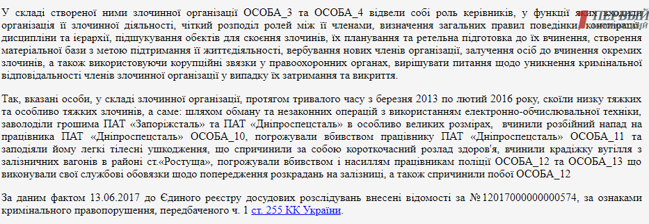 В течение длительного времени с марта 2013 по февраль 2016 члены ОПГ совершили ряд тяжких и особо тяжких преступлений, а именно: путем обмана и незаконных операций с использованием электронно-вычислительной техники, завладели деньгами двух металлургических предприятий Запорожья в особо крупных размерах.