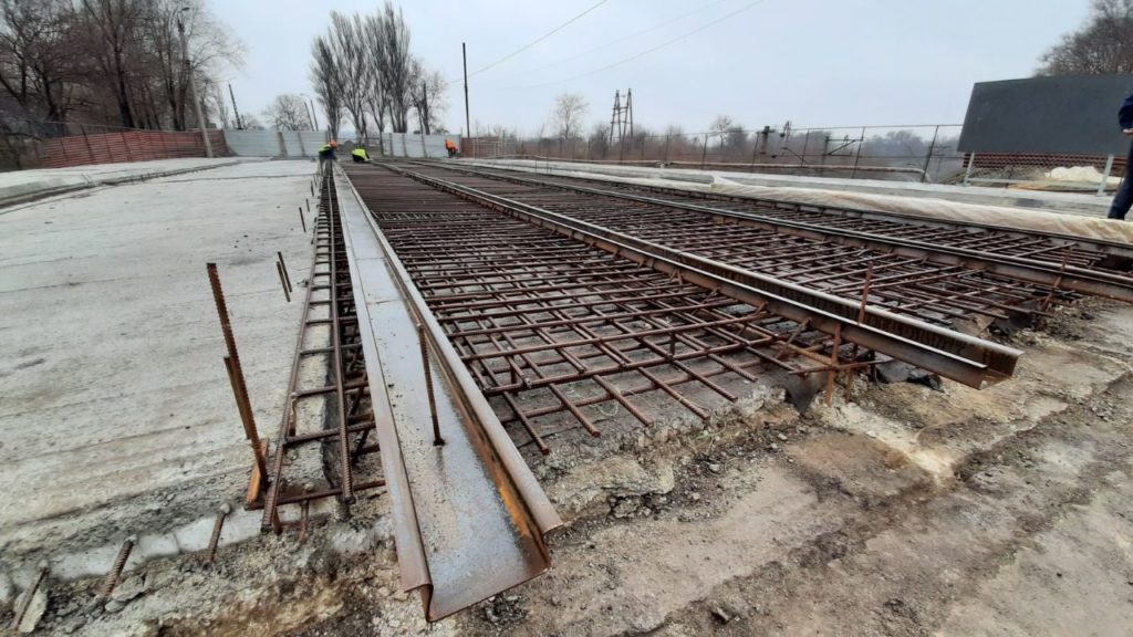 Крім цього, будівельники облаштовують монолітну плиту моста, а також безшумні трамвайні рейки. Після цього зроблять проїжджу частину і тротуари.