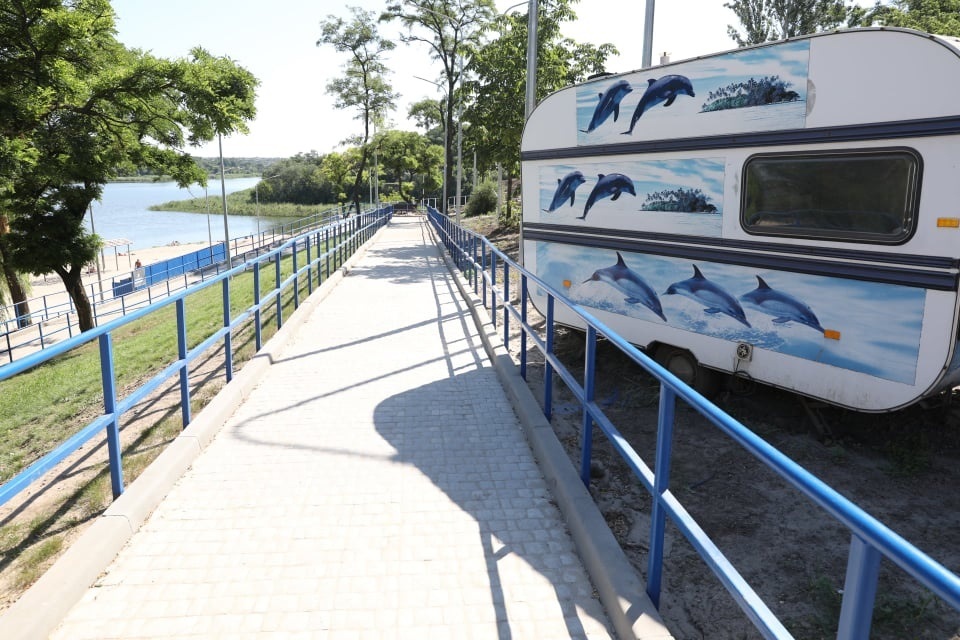 Від центрального входу до пляжу буде вести сходи – близько 11 сходових прольотів. Для відпочиваючих з особливими потребами вже облаштували пандус.