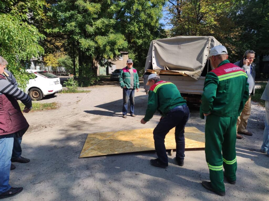 Співробітники комунальних служб разом з мешканцями міста працюють на місцях. Для перекриття розбитих вікон видають скло і плити OSB.